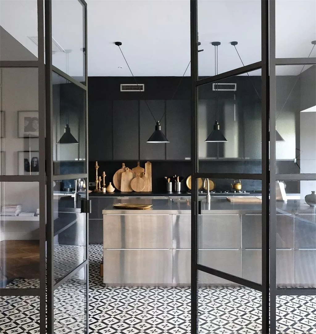 喜歡中式用餐的小伙伴,用玻璃門來代替隔墻就是很好的選擇,不管大空間還是小空間,這種透明的玻璃門既能阻擋油煙進入客廳,還能改善廚房區域的采光,同樣又開闊了視角,讓空間格調提升幾個檔次。