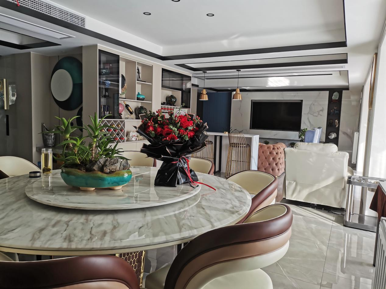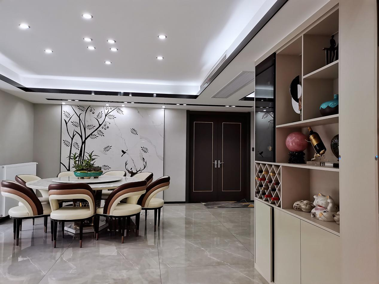 休閑區(qū)的墻面做了一個“一鹿有你”的背景墻,為了不會顯得地面飄,我適當的選擇了深色的圓桌壓低視線,而且預留了一個吧臺的位置,連著酒柜置物臺,放酒水、擺件兩不誤,沒事還可以坐在這小酌一杯!