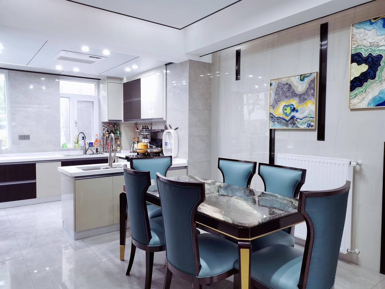餐廳的整體風格是和客廳相呼應的,桌椅選擇的也是北歐風格,墻上掛的兩幅高飽和度抽象畫也是專門為了搭配餐桌,在視覺上營造一種儒雅大氣視覺感受。
