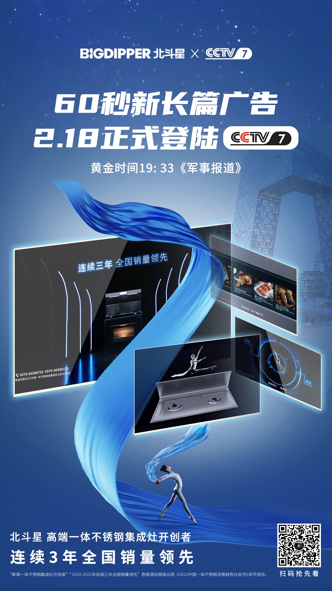 北斗星又又又上央視啦!北斗星高端一體不銹鋼集成灶60秒長篇廣告強勢登陸央視。今晚19:30,鎖定CCTV-7《新聞聯播》后。